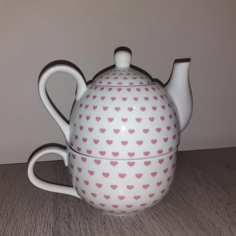 Leuk tea for one porselein setje in het wit met hartjes motief. Het setje bestaat uit een theepotje en een grote theekop.