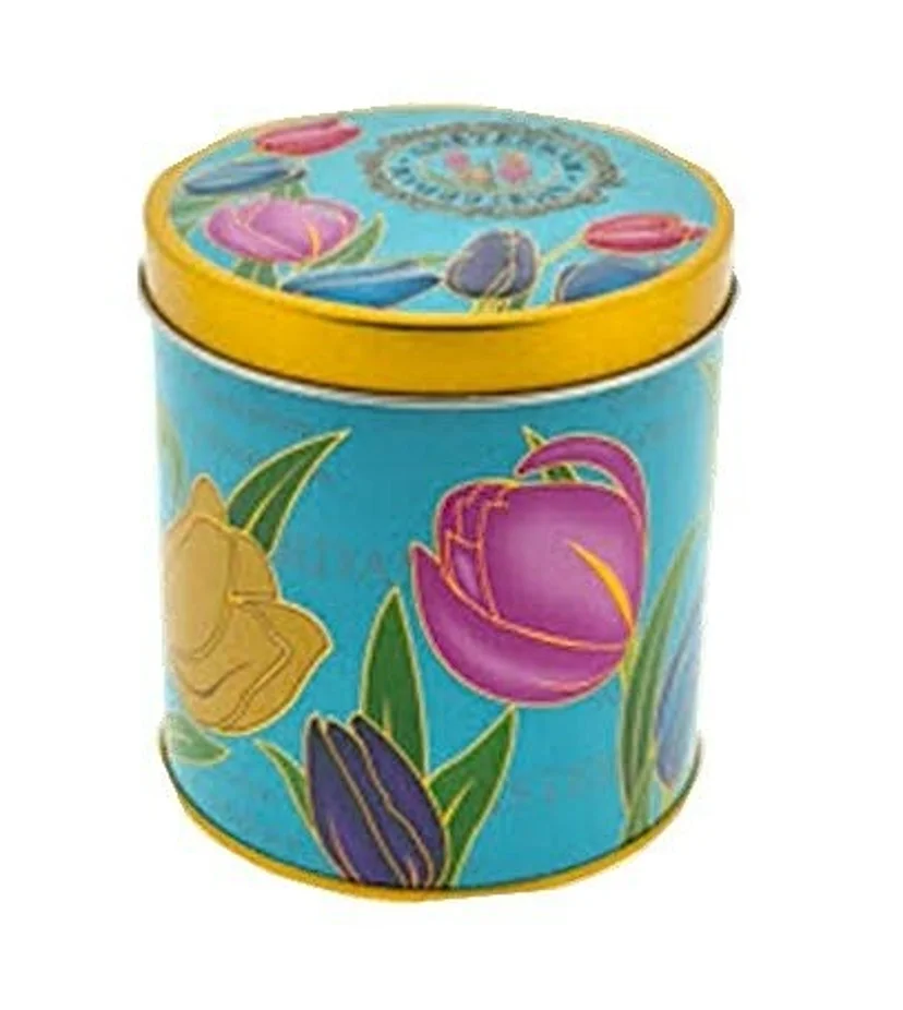 Blik roomboter stroopwafels met motief Tulp lichtblauwe achtergrond of met een zwarte achtergrond.