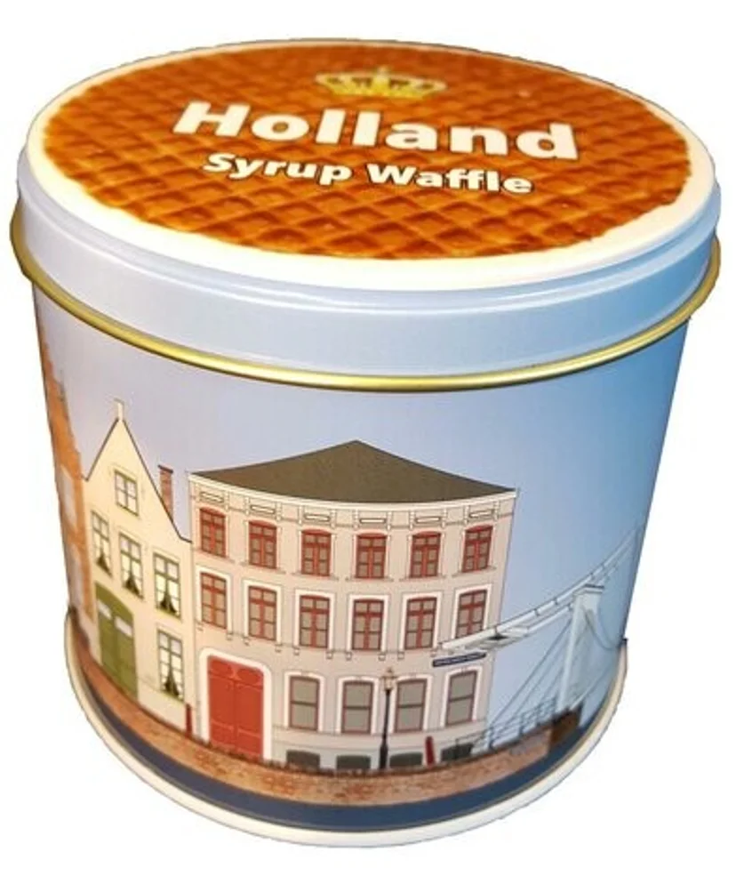 Prachtig gekleurd blik met een afbeelding van grachtenpanden. Op de deksel staat een afbeelding van een rondvaarboot op de gracht! Het blik is gevuld met een pak Stroopwafels!