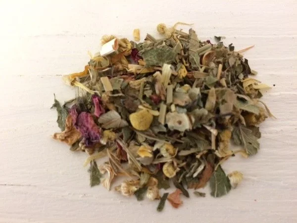 Een prettige thee voor de avond met onder andere melisse, kamille en pepermunt. Geeft een licht kruidige thee en zorgt voor een vredig gevoel. Ingredienten: Melisse-, kamille-, pepermunt-, aardbei-, zwarte bes en aalbesblad, hazelnootblad, sinaasappel-, lavendel, rozen- en heidekruidbloesem. Allergenen: hazelnootblad